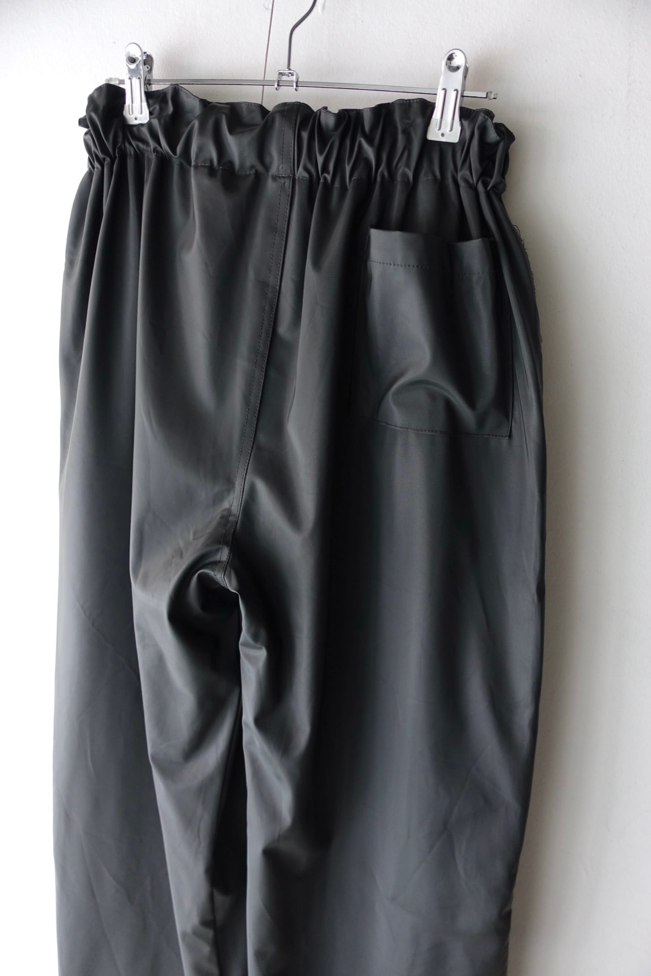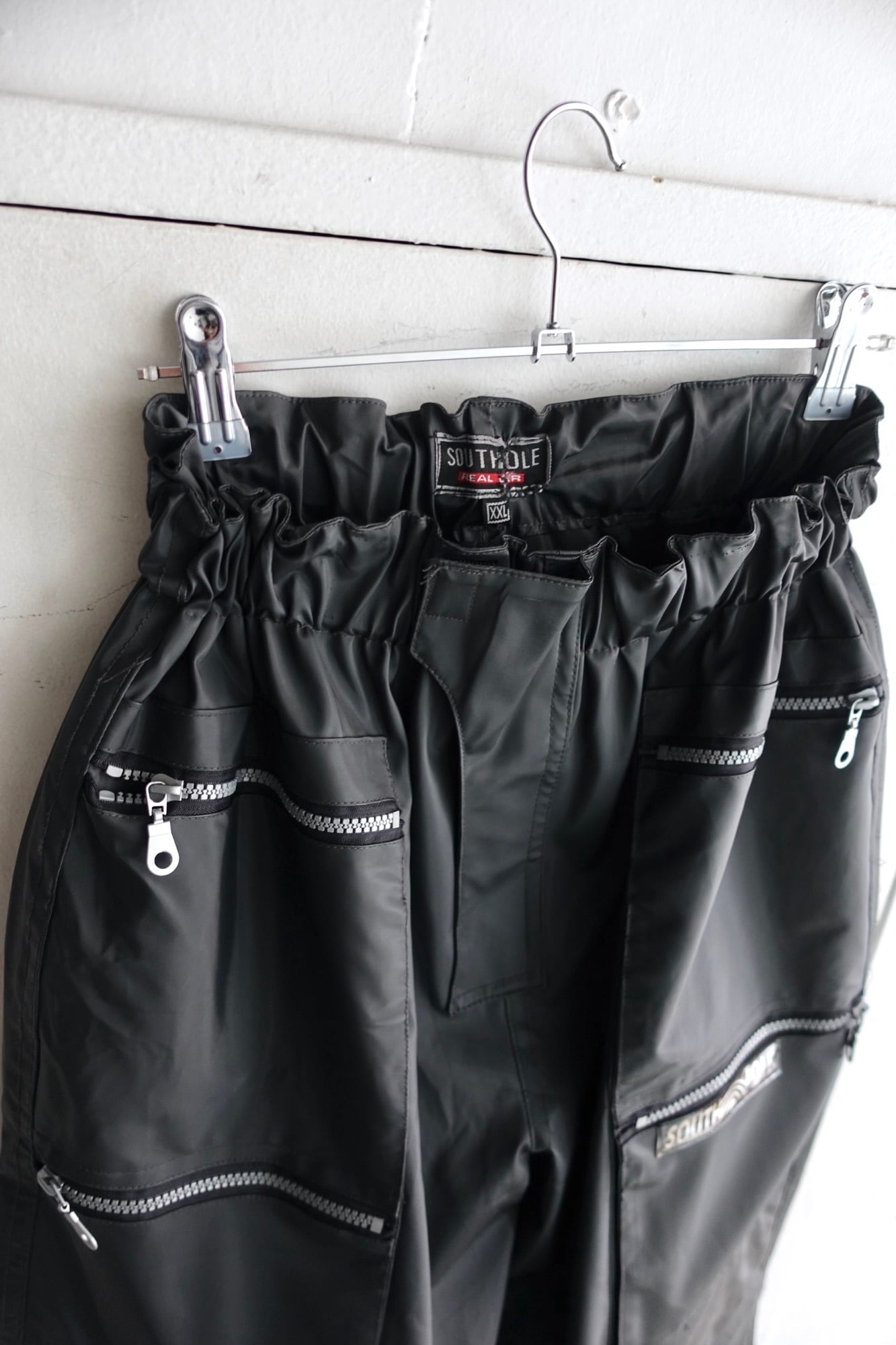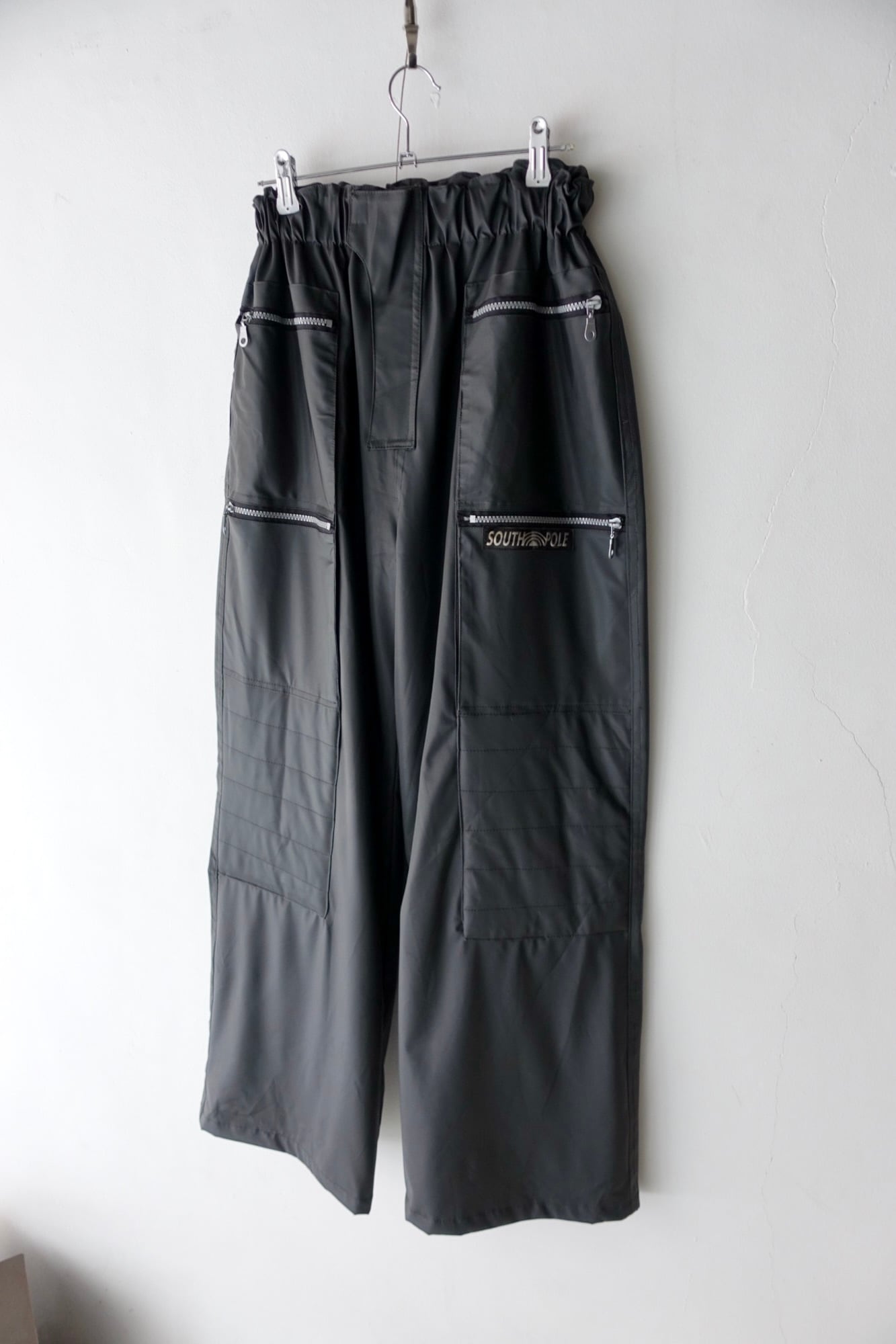material : pvc size: L waist: 30~52cm(elastic) length: 104cm Inseam: 72cm hem: 29cm shiny pvc shell multi zip pocket wide silhouette fitting: 175cm