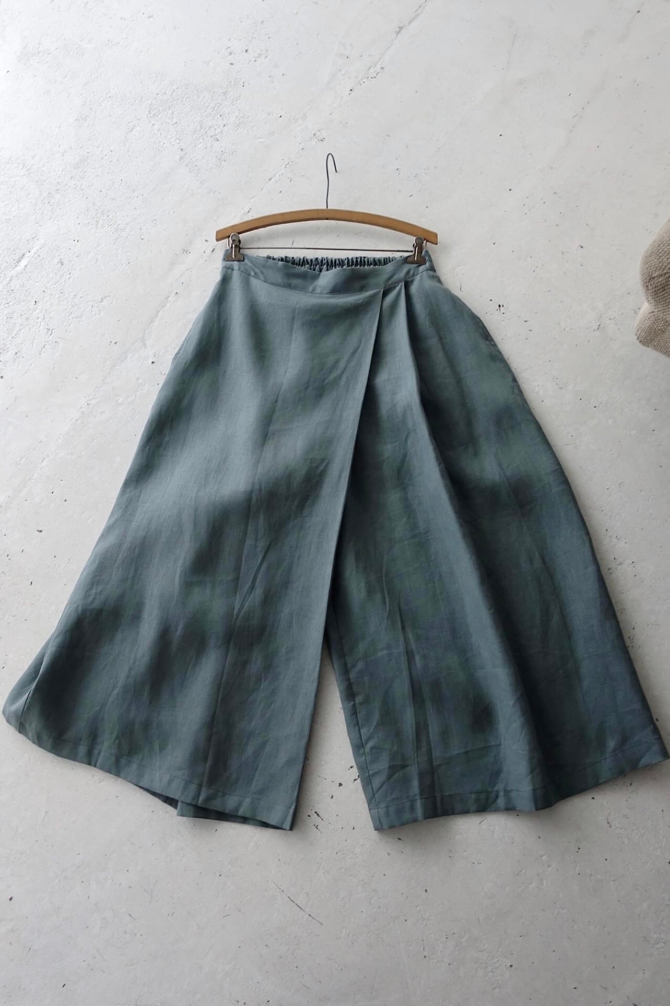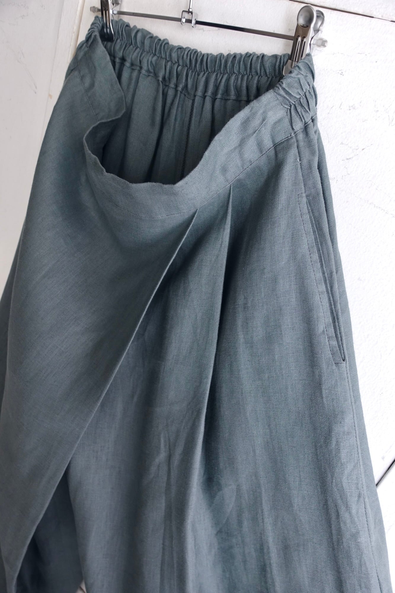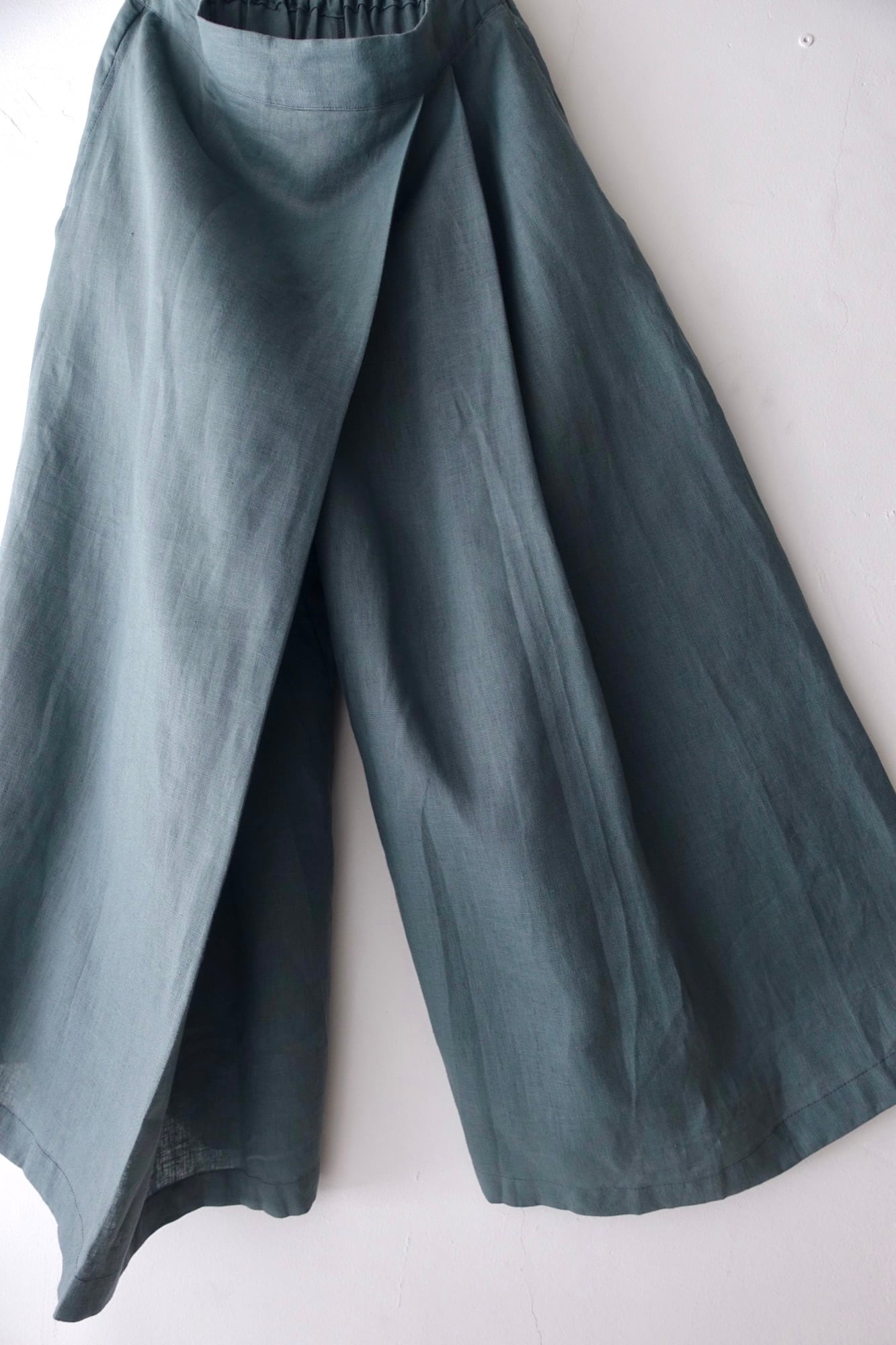material : linen size: L waist: 35~44cm(elastic) length: 90cm Inseam: 58cm hem: 48cm rough weave linen asymmetry front middle cut, super wide fitting: 175cm